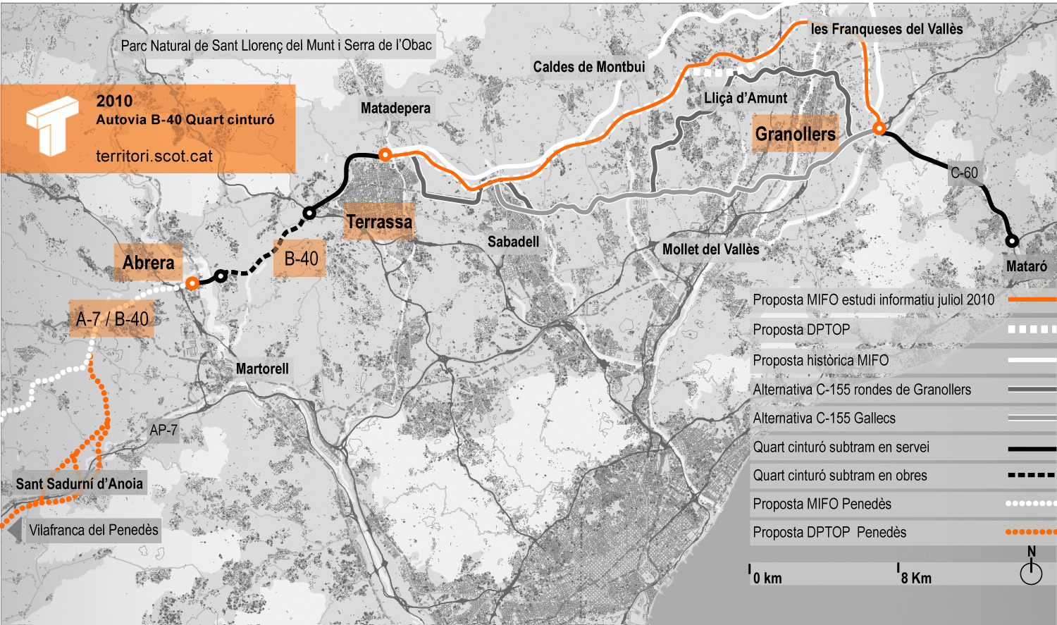PLA TERRITORIAL PARCIAL DE LA REGIÓ METROPOLITANA (PTPRMB). Al Penedès, el Pla apostava per fusionar la B-40 amb l’A7. Al tram del Vallès, preveia quatre possibles traçats, que es diferenciaven pricipalment pel grau d’allunyament cap al nord respecte de l’eix de l’AP-7. El més allunyat era el de la proposta del projecte original del MIFO. A continuació, seguia la denominada “traça Herce, sorgida de la proposta de l’enginyer Manuel Herce en un estudi encarregat pel DPTOP l’any 2006. Aquesta opció era la preferida pel PSC. Les altres dues eren variants més properes a l’AP-7, incloses a petició dels socis de Govern, ERC i ICV, i que proposaven aprofitar el traçat de la carretera de Granollers a Sabadell (C-155) –que passa prop de Polinyà i pel sud de Palau-solità i Plegamans–, si bé una de les propostes a partir d’aquest punt es desplaçava més cap al nord per Lliçà d’Amunt.