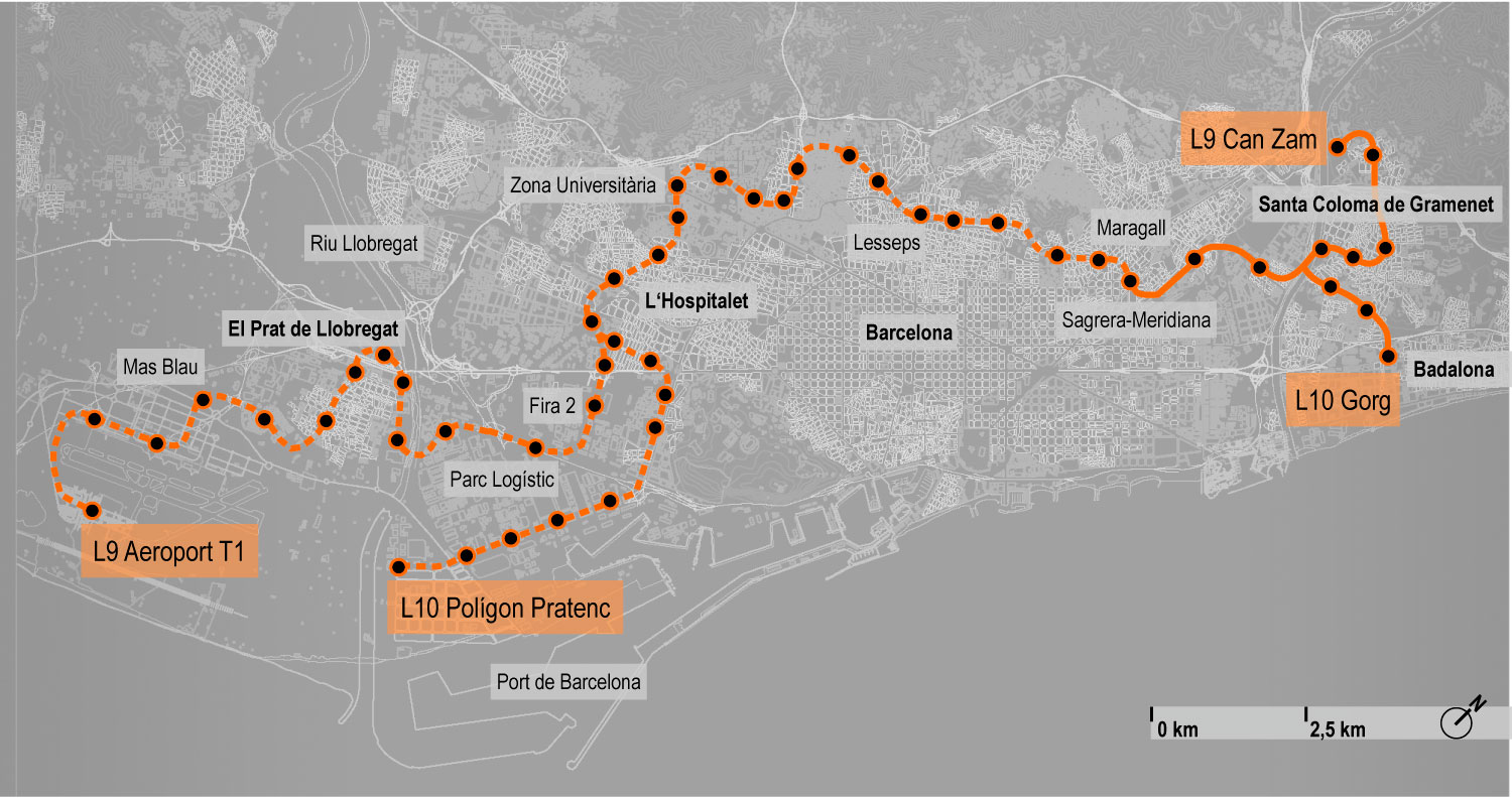 PORT DE BARCELONA, la Zona Franca (on la major part del traçat és en viaducte) i diversos barris (Pedralbes, Bon Pastor, Salut, Llefià, Singuerlín,…). El projecte preveu un total de 52 estacions (de les quals vint seran intercanviadors) que han de donar servei a 400.000 persones cada dia. Els seus 47,8 quilòmetres de recorregut es composen d’un tronc central (Gornal-Bon Pastor) compartit entre la línia 9 i la línia 10 i de dos ramals als dos extrems: la línia 9 va des de l’aeroport fins a Santa Coloma de Gramenet i la línia 10 de la Zona Franca a Badalona.