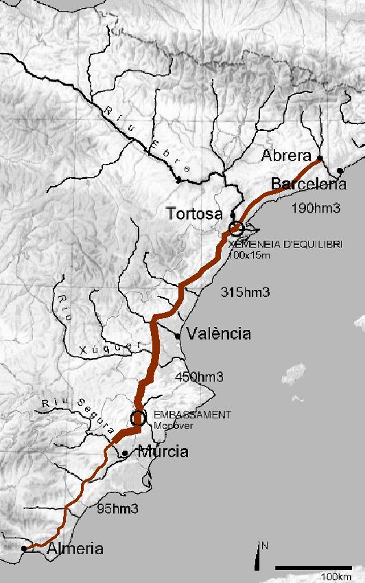 El projecte de transvasament presentat preveia per al riu Ebre un cabal mínim de 100 m3/s per poder transvasar els 1.050 hm3/any. Es preveia un total de 914 km de conduccions que, cap al nord, es concretarien en dues canonades paral·leles d’1’9 metres de diàmetre que avançarien al costat de l’AP-7 i un minitransvasament a Tarragona, amb un total de 172 km. El ramal sud, de 742 km, aprofitaria per al tram català part del canal Xerta-Sénia. El punt de captació per als dos ramals es faria dos quilòmetres al sud de Tortosa. La distribució de l’aigua transvasada prevista al projecte del transvasament era la mateixa que ja preveia la llei del PHN: 190 hm3/any a les conques internes de Catalunya, 315 a la conca del Xúquer, 450 a la conca del Segura i 95 a les conques del sud.